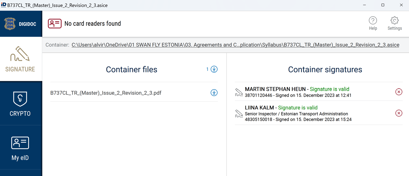 The Estonian Transport Administration uses digital signatures approved by the Estonian Government. Manuals are submitted in PDF format. Once signed, they are returned to the ATO in "Digidoc" format. To verify the identity of the inspector who signed the document, it is necessary to download DIGIDOC. More information is provided